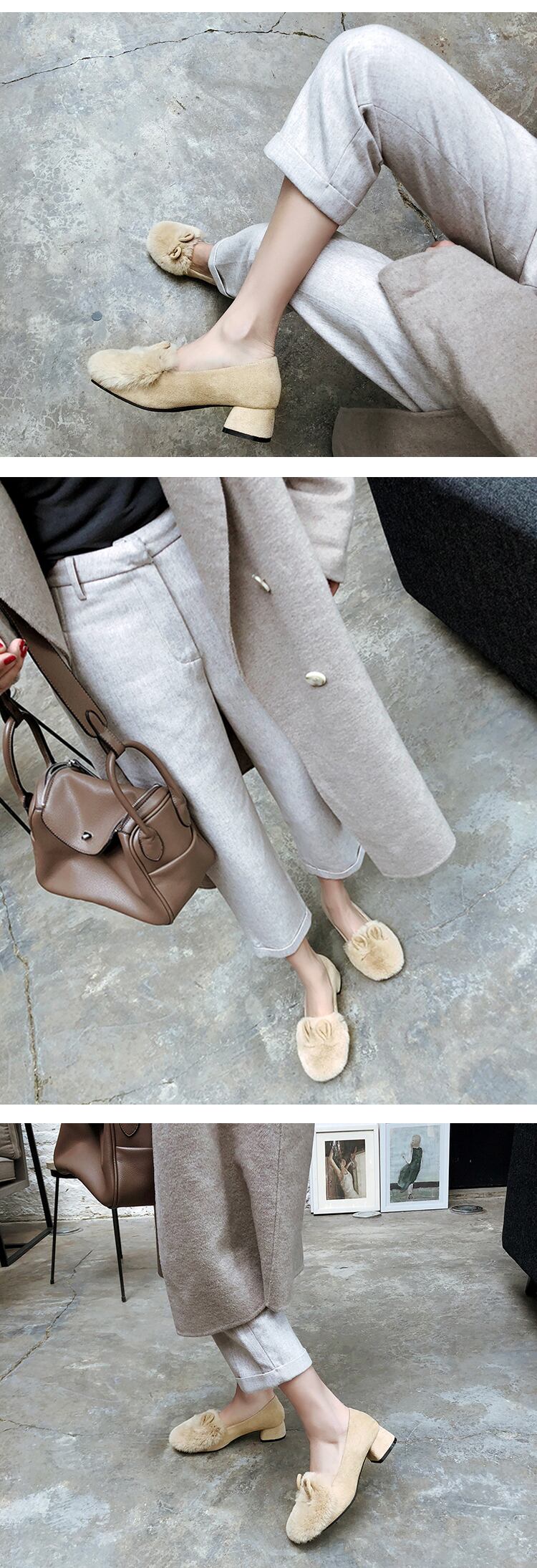 色:黒い太いヒール,アプリコットの厚いヒール,アプリコットフラット,黒い平底,グレーの平底