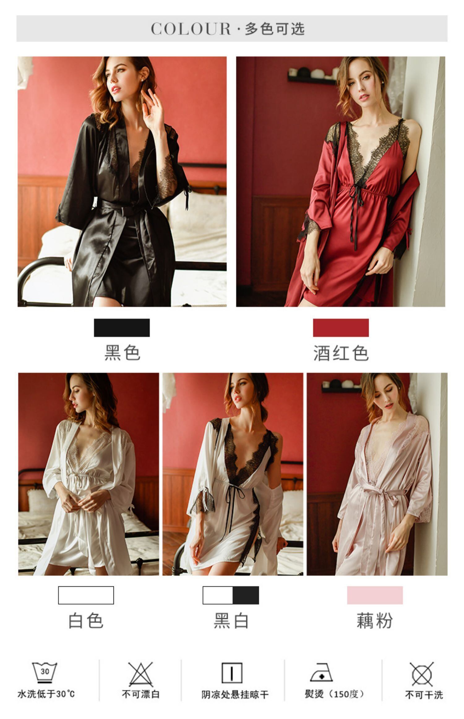 色:黒(ナイトスカート+皮ひも),黒と白(ナイトスカート+ひも),ブルゴーニュ(ナイトスカート+ひも),白(ナイトスカート+皮ひも),レンコンピンク(ナイトスカート+皮ひも),黒のスリーピーススーツ(ナイトスカート+ローブ+ひも),赤いスリーピーススーツ(ナイトスカート+ローブ+ひも)